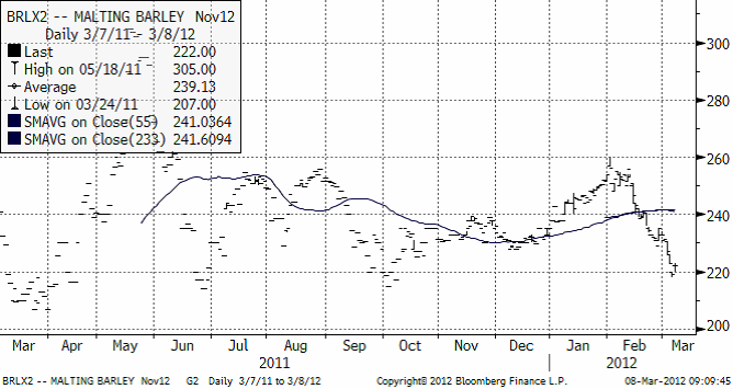Novemberkontraktet på maltkorn har fortsatt att falla med förnyad styrka ner mot nivåer kring 200 till 220 där marknaden tidigare har funnit stöd. Vi förväntar oss att prisfallet även denna gång hejdar sig åtminstone temporärt på den här nivån. Om man är ute för att prissäkra kan man därför gott avvakta något för att kanske kunna sälja på exempelvis 230 euro igen inom kort. Detta är dock inte helt säkert, förstås.