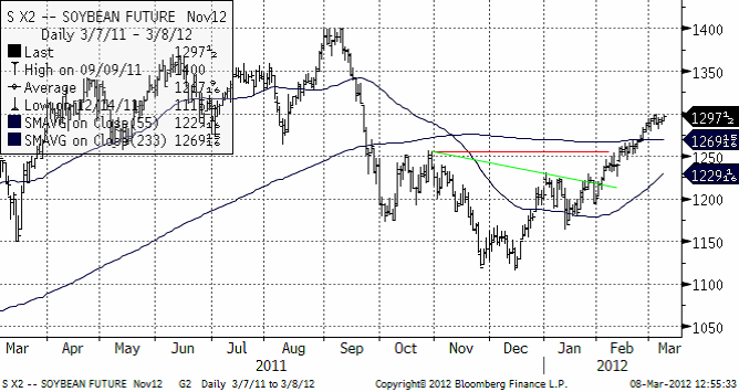 Novemberkontraktet verkar ha stött på säljare på 13 dollar per bushel. Priset står just nu och väger. En rekyl nedåt är naturligtvis inte osannolikt.