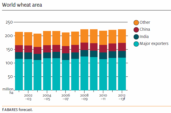 I sin prognos för 2012/13 skriver ABARES att trots en förväntad ökning av arealen för vete i världen uppskattas den globala veteproduktionen minska med 2 procent till ca 682 mt för 2012/13, vilket är i linje med IGC’s estimat förra månaden på 680 mt.
