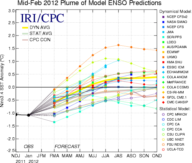 Nedan ser vi ensembleprognosen från amrikanska Climate Prediction Center. Den är gjord i mitten av februari, och den visade då att La Niña skulle klinga av och försvinna till neutrala ENSO-förhållanden till juni. Detta tycks nu, som vi sett, redan inträffat.