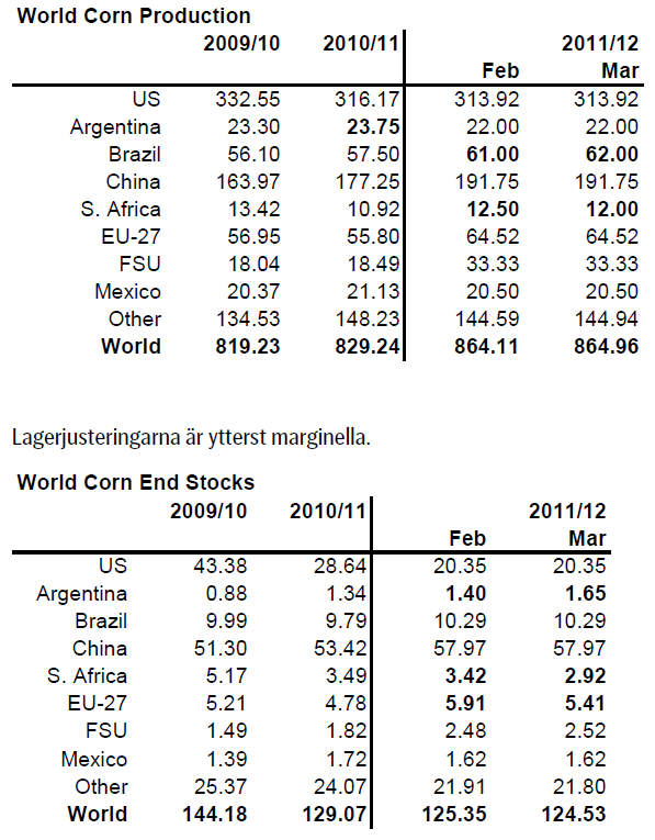 Utgående lager sänktes 3 mt, främst i Argentina och Brasilien. Pga de redan låga utgående lagren i USA har man på USDA valt att inte sänka USA:s lager.