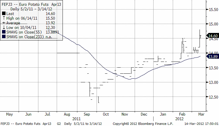 Priset på industripotatis för leverans nästa år steg ganska ordentligt i veckan som vi ser i nedanstående kursdiagram.