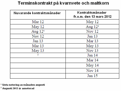 Den europeiska börsen Euronext (Matif) har utökat antalet kontraktsmånader för terminer och optioner på kvarnvete, maltkorn, rapsfrö och majs med fr.o.m. tisdagen den 13 mars 2012. En annan förändring som sker är också att kontraktsmånaden augusti för kvarnvete och maltkorn kommer att försvinna. Augusti 2012 blir därmed den sista noterade augusti månaden för dessa två råvaror. För kvarnvete och maltkorn kommer antalet kontraktsmånader att utökas från nuvarande 8 till 12 enligt nedan:
