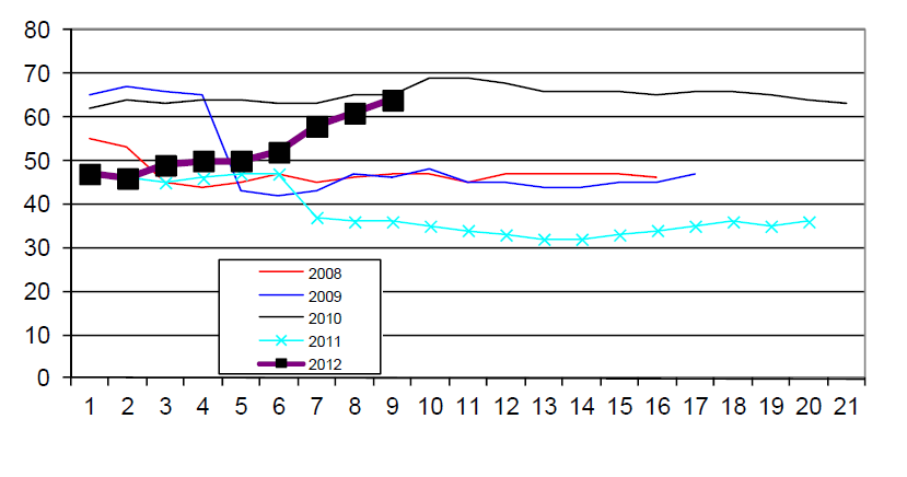 Tillståndet för Storbritanniens höstkorn är mycket bra enligt ADAS och sådden av vårkorn är klart till 96% och ser lovande ut. Nedan ser vi utvecklingen / takten i sådden av vårkorn i Storbritannen. Grön stapel är 2012. Som vi ser såddes det mesta i mars. Det fick sedan en ordentlig rotblöta och lite kallare väder i april.