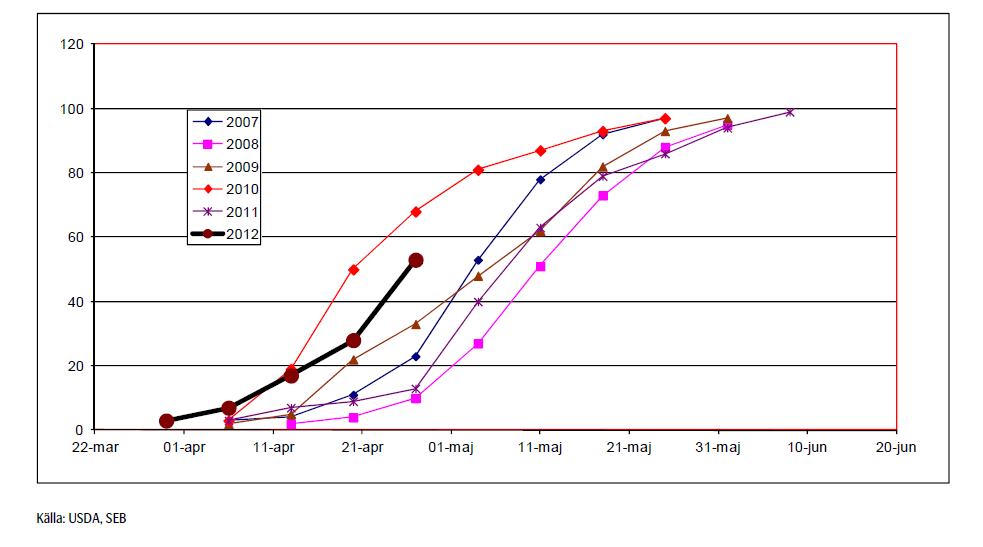 Sådden går fort framåt i USA. Den 20 april var 12% sått i USA. Förra veckan var det 6%. Vi ser noteringarna i diagrammet nedan som med blå kvadrater. Hittills ser det tidigt och bra ut.