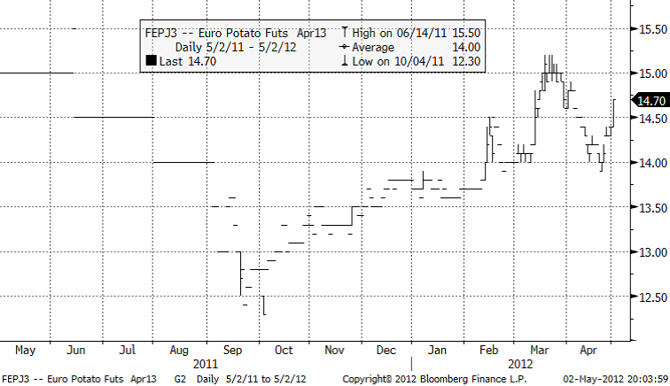 Potatispriset för leverans nästa år, steg oväntat idag. Den senaste veckan har priset stigit från 14 euro per deciton till 14.70 euro.