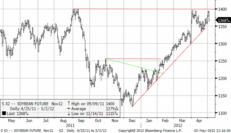 Marknaden testade mycket riktigt 1400 cent igen i veckan som gick. Men därefter föll priserna tillbaka under onsdagen (igår). Priset ligger nu precis på stödlinjen. Om den bryts på nedsidan signaleras att den stigande trenden från botten i december är över. Detta återstår att se bekräftas.