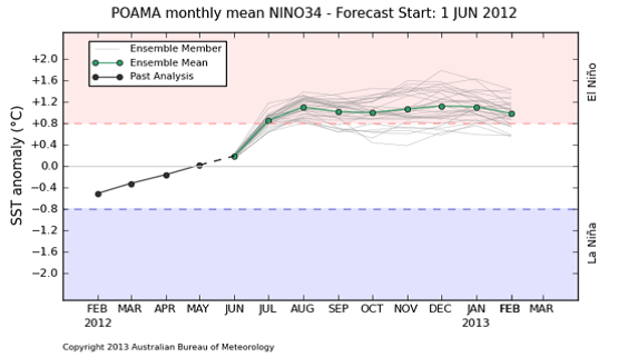 Nedan ser vi ensembleprognosen för ENSO med basdatum den 1 juni. Som vi nämnt ovan, ser vi att ingen av modellerna ens hamnar nära nollstrecket, än mindre en återgång till La Niña. Istället är den här uppdaterade körningen tydligare än i maj, att El Niño kan uppstå redan i juli.