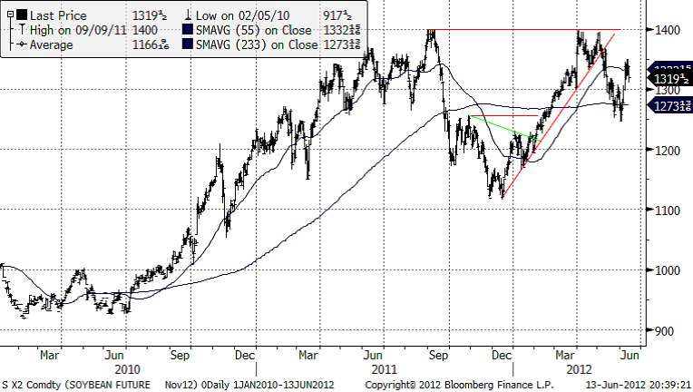 Nedan ser vi hur terminspriserna på Matif och Chicago förändrats den senaste veckan. Matif är oförändrad. Chicago har fallit över alla terminslöptider. Vi är hellre säljare av Matif än av Chicago, i synnerhet vad gäller december 2012, där Chicago ligger på lite drygt 190 euro per ton. Möjligen kan man våga sig på att köpa Chicago december och sälja Matif november i förhoppning om att priserna ska konvergera.