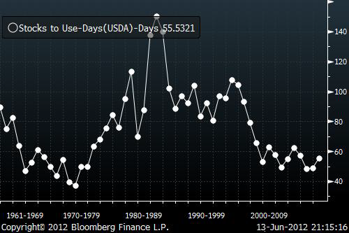 Lagren av majs har länge varit låga, men nu väntas alltså högre utgående lager, som ser i nedanstående diagram. Diagrammet visar utgående lager i termer av dagar av konsumtion sedan 1961. Efterfrågan från Kina och andra tillväxtländer och efterfrågan på råvara till etanoltillverkning har hållit lagren pressade. När det gäller etanol är ökningen i efterfrågan med största sannolikhet över. I USA har man nått upp till 10% inblandning och högre går inte att gå utan skador på motorerna. Naturgas har blivit ett extremt billigt bränsle i USA och kommer troligtvis att ta marknadsandelar både på bensinens och därmed också etanolens bekostnad.