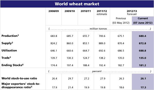 FAO:s prognos för den globala produktionen av vete 2012/13 visar en nedjustering från förra säsongen till 680 mt, vilket dock är 5 mt högre än tidigare prognos och fortfarande en bra bit över genomsnittet de senaste fem åren.