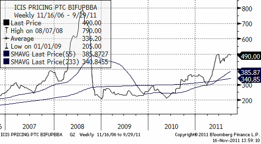 Nedan ser vi prisutvecklingen på Urea FOB Yuzhny i dollar per ton.