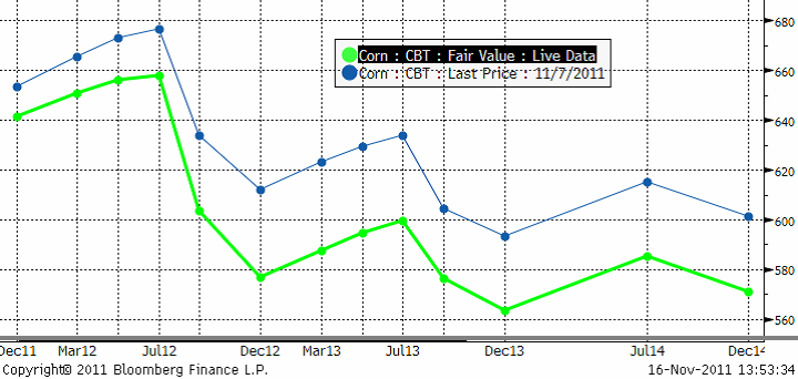 Nedan ser vi terminskurvan för Chicagovete och Matif nu och för en vecka sedan.