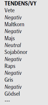 Det mest sannolika är nog ett test nedåt på sojabönorna, men fundamenta ger stöd just nu. Vi väntar oss nog ändå att säljarna kommer in – från Brasilien om inte annat – och säljer ner sojabönorna under stödet på 1167. På tre månaders sikt är vi negativa.