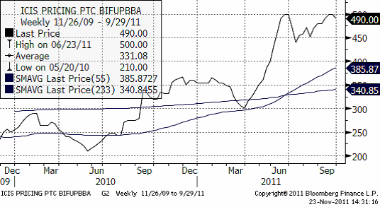 I diagrammet nedan ser vi decemberkontraktet 2011. Det avser priset nu i december och har därför ingen säsongsvariation som stör. Trenden är uppåtriktad och priset har stigit stadigt hittills i år, helt opåverkat av skuldkris.