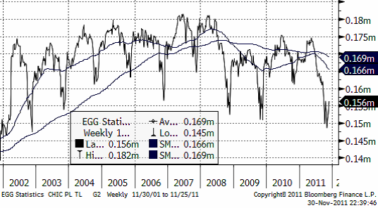USDA rapporterar att antalet kycklingar satta på uppfödning till broiler låg på den lägsta nivån sedan 2002. Det finns en säsongsvariation, som gör att det är lågt just nu, men 2011 ligger lågt som helhet, i nivå med krisåret 2009. Detta gör naturligtvis att efterfrågan på majs och även sojamjöl i USA är lågt.