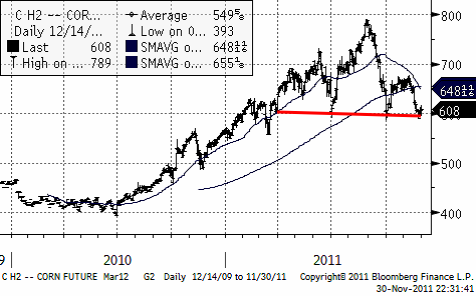 Nedan ser vi marskontraktet på CBOT, där priset ligger på den nivå vid 600 cent där marknaden funnit stöd flera gånger. Den svagare dollarn gav ytterligare stöd för majspriset idag. Priset föll dock av ändå och stängde lågt.