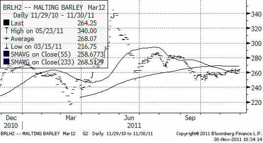 Maltkornsmarknaden följer vetet och det finns inga speciella nyheter att rapportera. Tekniskt ligger priset under glidande medelvärden. Den tekniska trenden är alltså nedåtriktad.