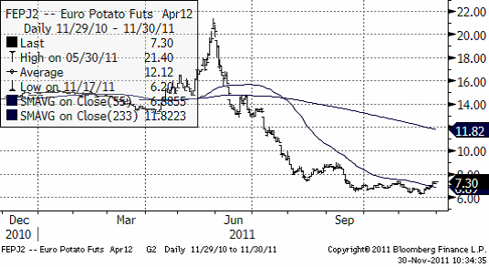 Nedan ser vi kursdiagrammet på europeisk potatis, som handlas på Eurex; terminen avser leverans april nästa år.