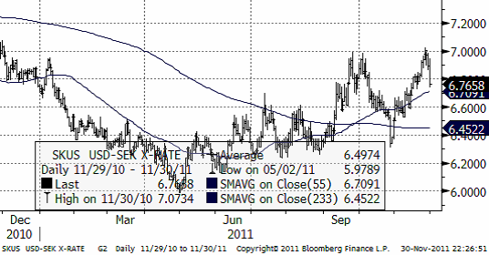 USDSEK föll kraftigt som en reaktion på de sex centralbankernas samlade aktion att pumpa in dollar i ekonomin.