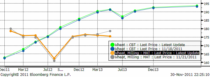 Nedan ser vi terminskurvan för Chicagovete och Matif nu och för en vecka sedan. De ”feta” kurvorna är de aktuella. De ”smala” är förra veckans.