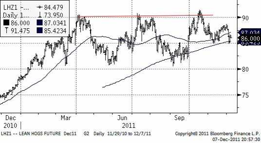 Tekniskt vilar priset på lean hogs på de glidande medelvärdena. Att priset ligger över gör att trenden är uppåtriktad. Det har inte kommit några nämnvärda nyheter sedan förra veckan. Tekniskt är bilden väldigt otydlig.