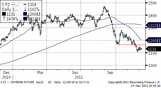 Priset på sojabönor befinner sig i en sjunkande trend. Priset har rekylerat upp lite den senaste veckan och det torde vara ett bra säljtillfälle.