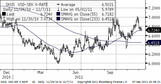 USDSEK har en stigande trend. Just nu vilar priset på 55-dagars glidande medelvärde, och det ger stöd (många tittar på den tekniska indikatorn).