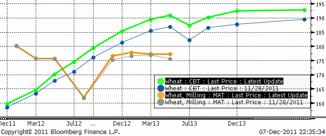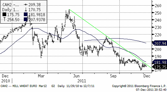 Terminspriset på Matif-vete (mars) har handlats i spannet 174.75 eur – 179.00 eur sedan förra veckan. Viss fundamenta har angett riktning för priset men marknaden påverkas också i nuläget av den oro som råder över den ekonomiska krisen i Europa. Aktiviteten har dock varit låg i avvaktan på fredagens WASDE rapport och utgången av EU-toppmötet.