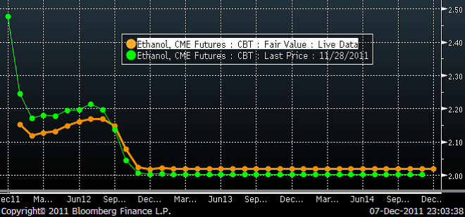 Etanolmarginalen för amerikanska brännerier har säckat ihop och det beror på att etanolpriset handlas betydligt lägre för leverans nästa år jämfört med i år. Skatterabatten för att blanda etanol i bränsle försvinner, som bekant. Nedan ser vi terminspriserna framåt i tiden, där den nedre, lite kraftigare linjen är terminskurvan från onsdagskvällen (igår), medan den smalare är terminskurvan för 7 dagar sedan (den första av de terminerna har hunnit förfalla till idag).