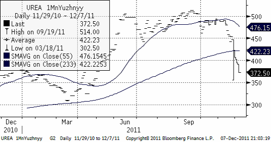 Nedan ser vi 1 månads terminspris på Urea fob Uyzhnyy. Priset har fallit kraftigt under hösten.