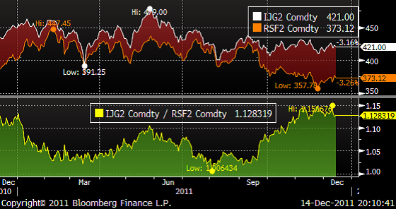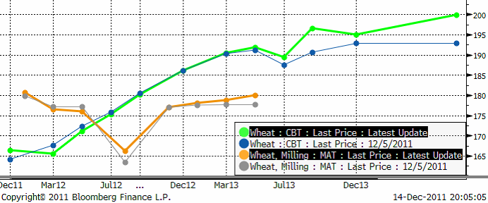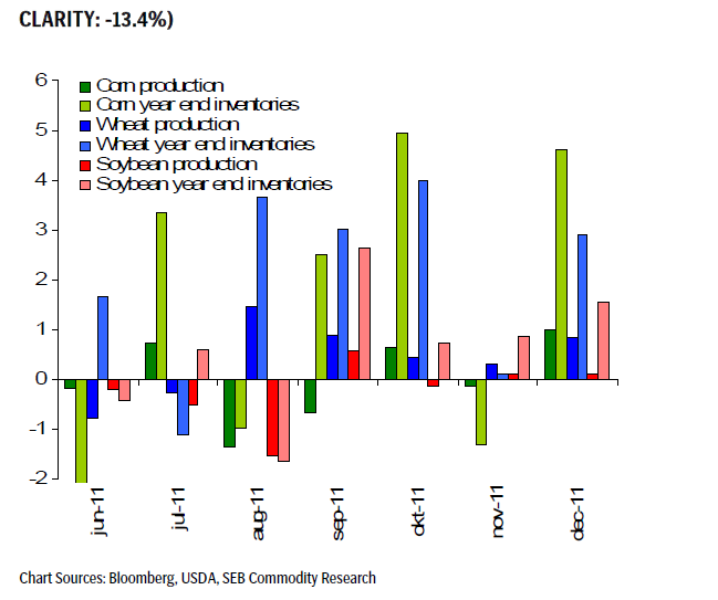 Utgående lager (world wheat ending stocks) för 2011/12 justeras upp till 208.52 mt jämfört med 202.60 mt för en månad sedan. Detta gör att vi nu börjar närma oss historiska rekordnivåer. Intressant var också utgående lager för USA. Innan rapporten förväntade sig marknaden en snittsiffra på ca 830 miljoner bushels, en liten förändring från novembers 828 miljoner bushels, men när rapporten kom hade USDA justerat upp siffran med 50 miljoner och landade på 878 miljoner till följd av en nedjustering på 50 miljoner bushels för estimerad export.