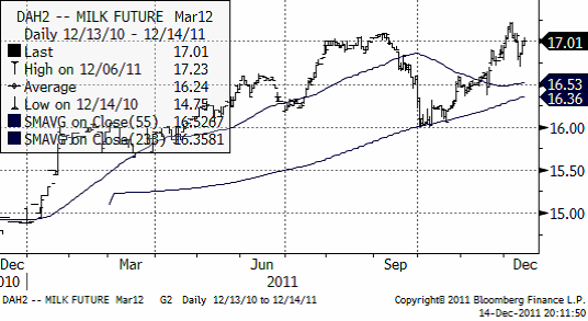 Nedan ser vi priset på marskontraktet på flytande mjölk (kontakt avräknat mot USDA:s prisindex). Priset har varit väldigt rörligt den senaste tiden. Trenden är uppåtriktad, men är vid den nivå som priset toppade vid under sensommaren. Det kan utgöra ett motstånd för ytterligare prisuppgång.
