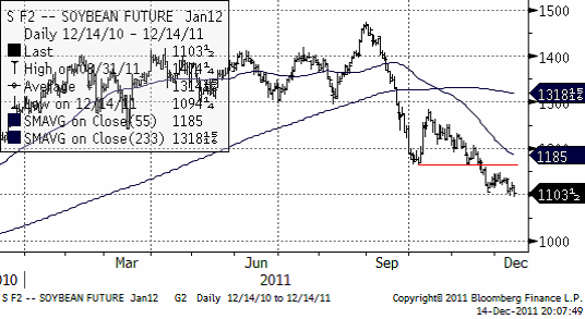 I detta det sista veckobrevet för 2011 om marknaderna för jordbruksprodukter kan vi summera året. Det senaste året har priset på kvarnvete sjunkit med 23%, rapsfrö med 12%. Mjölkpriset har stigit med 35% och urea med 52%. Tack vare gynnsamt väder har priset på potatis fallit med 71% på Eurexbörsen i Frankfurt. Dollarn är upp med 3% mot svenska kronor och euron är oförändrad, faktiskt.