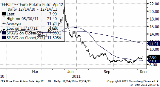 Priset på potatis av årets skörd fortsatte stiga i veckan, ännu en vecka. Rapporten kom från Jordbruksverket tidigare i veckan om en betydligt högre skörd av matpotatis i Sverige, men informationen nådde alltså marknaden redan på försommaren, när priserna började falla. Nedan ser vi kursdiagrammet på europeisk potatis, som handlas på Eurex; terminen avser leverans april 2012.