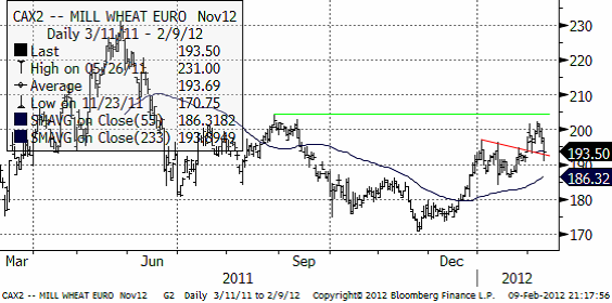 Nedan ser vi kursdiagrammet på europeisk potatis, som handlas på Eurex; terminen avser leverans april 2013.