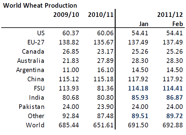 Det kalla vädret har också varit en bidragande faktor till oro. I Ryssland verkar dock snötäcket skydda de flesta grödor medan det kalla vädret i Svarta havsområdet kan komma att orsaka skador på framförallt korn och raps. Trots det kalla vädret i Europa så är påverkan av rapsgrödorna i Tyskland och Frankrike dock mindre oroande. I Ukraina är problemen desto större med effekten av kylan på de grödor som redan har drabbats av en oerhört torr höst och där vissa delar av landet har fått mycket snö, på sina ställen upp till 50 cm, medan andra delar av landet helt saknar snötäcke grödorna därmed exponeras för den extrema kylan. Med en mild höst och en ”varm vinter” kan det hända att grödorna blir något mindre vinterhärdiga än förväntat men det verkar dock som att de flesta europeiska länder har fått ett skyddande snötäcke mot kylan, även om det på vissa ställen vore önskvärt med ett större snödjup. Ännu är det dock för tidigt att sia om eventuella konsekvenser. Nedan ser vi WASDE-rapportens estimat för global veteproduktion.