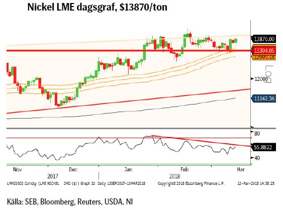 Nickelpriset fortsätter att visa styrka då andra industrimetaller backat tillbaka ned samtidigt som nickel i fredags steg kraftigt. De prognosticerade underskotten för 2018/19 bör redan vara prissatt och efterfrågan från batterisektorn är ännu för liten för att ha någon större påverkan varför vi fortsätter att ställa oss frågande till dagens nivåer. Mer information avseende Filippinsk produktion bör förhoppningsvis komma under våren. Efter miljöminister Lopez (avsatt förra våren) revision av gruvnäringen så är en hel del av de 41 nickelgruvorna stängda vilket fick produktionen att falla med 34 % under 2017. En del av detta bortfall bör så småningom komma tillbaka.