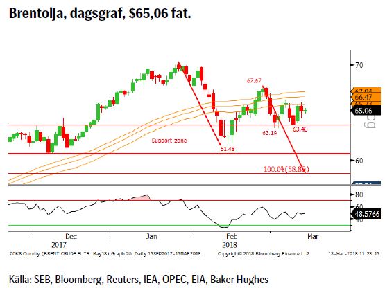 Sedan förra veckan har marknaden verkligen varit obeslutsam med upp och nedgångar i huvudsak i ett 63.50 – 66 intervall. Spekulanterna har fortsatt att minska den fortsatt väldigt stora långa nettopositionen. Rykten säger att Saudiarabiens börsintroduktion av Aramco kan komma att skjutas upp till 2019 vilket ger landet ytterligare incitament att hålla oljepriset upp under 2018. Antalet borriggar föll den gångna veckan vilket fick oljepriset att studsa upp i fredags, uppgången höll dock inte i sig längre än till igår måndag. Vi förväntar oss mer nedgång innan denna korrigering är färdig.
