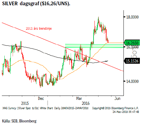 Sannolikheten för en amerikansk räntehöjning har sedan förra veckan stigit, vilket medfört en starkare dollar samt också motvind för framför allt metaller. Vi bör sannolikt räkna med en fortsatt stigande dollar inför Feds junimöte (14 och 15 juni, räntebesked den 15:e) vilket kan tänkas förlänga korrektionen för guld och silver.
