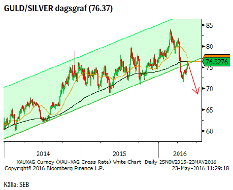 - Guld/silver förhållandet talar för fortsatt större prisstegring för silver jämfört med guld på lite sikt. Korrektionen upp mot 75 (uns silver för ett uns guld) bör nu vara i sin slutfas.