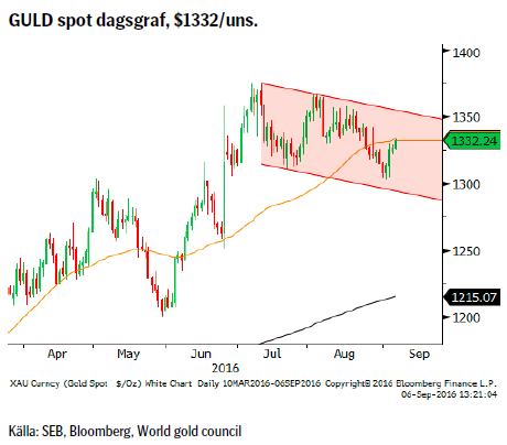 Valuta: Dollarn har tappat en hel del av den styrka som infann sig efter Brexit (även om vi senaste veckorna sett en viss förstärkning). FED är fortfarande avvaktande men givet positiv amerikansk ekonomisk statistik så rycker en räntehöjning närmare (sept, nov eller dec) vilket bör bryta dödläget. Den svenska kronan fortsätter att handla svagt och ingen vändning ser ut att ske i närtid. Pundet rekylerar för närvarande högre efter de kraftiga utförsäljningarna i samband med Brexit.