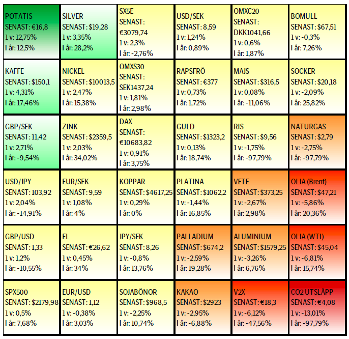 Råvaror: Det har verkligen svängt i oljan under sommaren. Säsongsmässigheten pekar på möjligheten till att toppen i juni var slutet på årets uppgång (återstår dock att se). Spekulationer om eventuella produktionsbegränsningar vid nästa månads informella OPEC möte i Algeriet samt ett avtal (om vad är dock något oklart) mellan Ryssland och Saudiarabien har dock för närvarande begränsat nedsidesrisken (risken är dock stor att det åter blir en besvikelse á la Doha). Ädelmetallerna gick starkt i början av sommaren men rallyt ser ut att ha kommit av sig (närheten till tuffa motstånd är också en begränsande faktor). Basmetaller och då framför allt alu och koppar kämpar i motvind och vi skulle inte vara förvånade att se priserna fortsätta att backa ytterligare ett tag. Zink möter allt mer av kommersiellt säljtryck då producenter skyddar sin produktion. Jordbruksprodukter som vete, majs, soja m.fl. har fallit ordentligt från sommarens början men kanske kan åtminstone en paus i säljandet skönjas. Kaffe ser dock ut att kunna ha påbörjat en ny uppgångsfas.