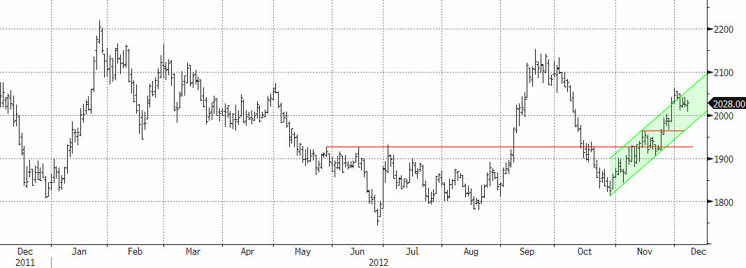Priset konsoliderade under veckan. Pristoppen i veckan kan vara den punkt som skapar en mer relevant motståndlinje (se chart) framöver att hålla ögonen på. Som vi sagt tidigare riskerar det stora LME-lagret att verka hämmande på priset. Vi kan mycket väl se en tillbakagång i veckan. $2000 är en bra stödnivå och en lämplig nivå för den som vill komma in i marknaden.