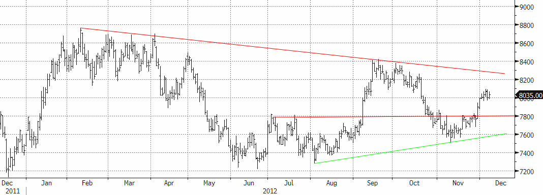 Priset konsoliderade mellan $8000 och $8100 under veckan. Det står och väger med det starka stödet vid $7800 (ett första psykologiskt stöd vid den jämna $8000-nivån), och motstånd vid strax över $8200. Koppar har släpat efter övriga basmetaller sedan vändningen uppåt i förra månaden. Koppar har kroniskt varit i en underskottssituation de senaste åren. Det är framför allt Chile som hela tiden visat lägre halter och produktionsproblem. Många prognoser tyder nu på att produktionen kommer att öka tillräckligt för att skapa en marknad i balans eller till och med ett visst överskott. Det har pratats mycket om det och är enligt vår mening till stor del redan diskonterat i dagens priser. Med rådande förväntningar på den nya regimen i Kina och sannolika infrastrukturprojekt, framför allt kopplade till elförsörjning, bedömer vi risken större på uppsidan. Som sagt priset står och väger, besvikelser över några konjunkturdata kan mycket väl innebära en rekyl nedåt. Kommer priset ner mot $7800 är koppar klart köpvärd.