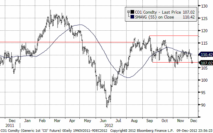 Nedan ser vi spotkontraktets kursutveckling. Priset ligger precis på stödet 107 dollar. Nästa stöd finns på 105 dollar.