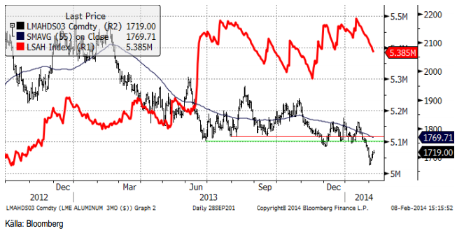Aluminium, den svagaste bland basmetallerna, föll under den tekniska stödnivån under januari. Sedan dess har priset rekylerat upp, samtidigt som lagren sjunkit. Vi skulle ändå inte vilja köpa aluminium än.