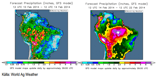 För två veckor kunde du här läsa utförligt om torkan i de brasilianska delstaterna Minas Gerais och Espirito Santo, som är centrum för kaffeproduktionen i landet och därmed i världen. Torkan har fortsatt och det är klart att årets kommande skörd blir mindre än förväntat. Det talas också om att nästa års skörd också kommer att påverkas, i kanske ännu större utsträckning. I fredags kom dock de första väderleksrapporterna med nederbörd för området. Somar Meteorologia skrev i en emailad rapport i fredags att torkan kommer att bestå under den första halvan av februari. Därefter kommer de kallfronter som finns över Argentina och Uruguay att röra sig norrut och med kallare väder och nederbörd.