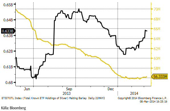 Nu har institutionella placerare börjat köpa guldfonder igen! Den gula kurvan visar antal miljoner uns som ägs via börshandlade fonder/certifikat/depåbevis. Innehaven i silver, den svarta kurvan, har ökat kraftigt sedan början av året.