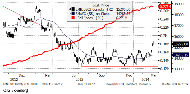 Det som fått nickelpriset att gå upp är utbudssituationen senare i år, pga Indonesiens exportförbud av malm. Nickelpriset brukar anpassa sig fort till förändrade utbudsförhållanden och det har kommit rapporter från Kina om att den något sämre malmen från Filippinerna har stigit kraftigt i pris.